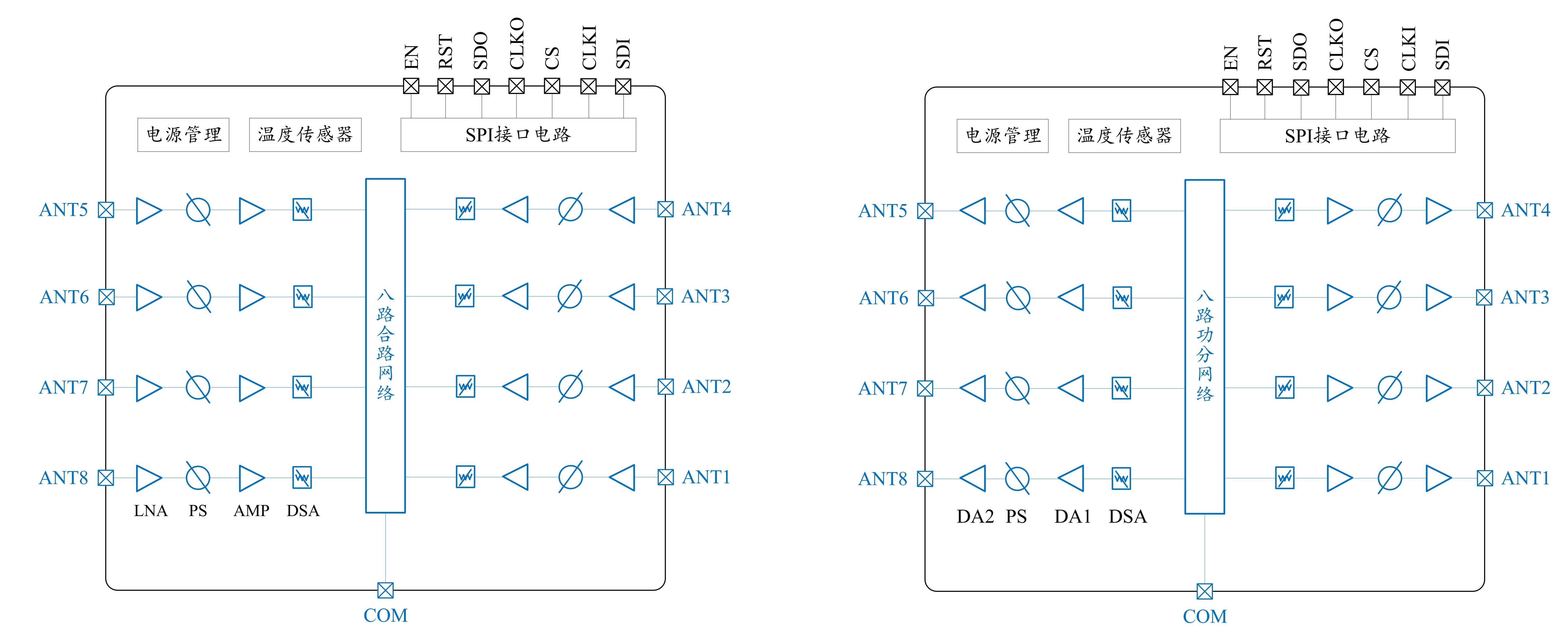 ARW95730是一款Ka波段8通道高集成度波束賦形發(fā)射芯片,共有8個(gè)射頻支路和1個(gè)公共路,可以支持圓極化四天線或單極化八天線應(yīng)用。工作頻率覆蓋27~31GHz,關(guān)鍵射頻指標(biāo):發(fā)射功率11.5dBm,發(fā)射增益22dB,每通道動(dòng)態(tài)功耗120mW,芯片內(nèi)部除了集成SPI接口電路以外,還集成了電源管理和溫度傳感器,BGA封裝。